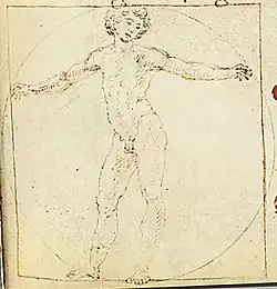 ap(er)te me(m)bra fia il bellicho. Ello spatio chessi truova infralle ga(m)be fia tria(n)golo equilatero” - ↑ Dedesubtul imaginii:„Tanto ap(r)e l'omo nele b(r)accia, qua(n)to ella sua alteza.