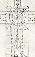 Punctele ce determină aceste proporții sunt marcate cu linii pe desen. Sub desenul propriu-zis este o singură linie egală cu o latură a pătratului și împărțită în patru cubituri, dintre care cele două din exterior sunt împărțite la rândul lor în șase palme fiecare, două dintre care au textul "palmi" scris în oglindă; două dintre palmele din exterior sunt împărțite la rândul lor în patru degete fiecare, și sunt notate "diti".