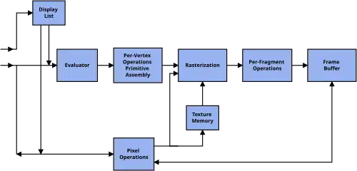 Funcțiia de bază a OpenGL este de a accepta primitive, cum ar fi puncte, linii și poligoane, și de a le converti în pixeli. Acest lucru se face printr-o conductă grafică (graphics pipeline), cunoscută sub numele de mașină de stare OpenGL. Cele mai multe comenzi OpenGL primitive, sunt fie probleme la conducta grafică, sau configurarea felului în care aceste procese de conducte de primitive. Înainte de introducerea OpenGL 2.0, fiecare etapă din conductă efectua o funcție fixă și a fost configurabilă numai în limite restrânse. OpenGL 2.0 oferă mai multe etape, care sunt pe deplin programabile folosind GLSL.