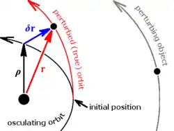 - Animație a orbitelor a trei corpuri: linia fină este orbita osculatoare, calculată dinainte, în timp ce orbitele reale sunt calculate digital pentru fiecare „pas” al animației.