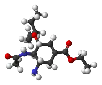Oseltamivir (cu denumirea comercială Tamiflu)[6] este un medicament antiviral din categoria inhibitorilor de neuraminidază (alături de zanamivir și peramivir), folosit în profilaxia postexpunere și tratamentul gripei cu virus gripal A și B[7]. Blochează răspândirea virusului gripal la nivelul celulelor organismului. Oseltamivir a fost primul inhibitor de neuraminidază de administrare orală comercializat, sub denumirea de Tamiflu. Este un pro-medicament care suferă o hidroliză hepatică și se transformă în metabolitul activ, oseltamivir carboxilat liber (GS4071).