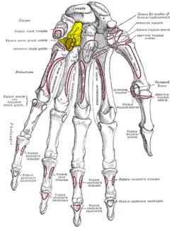 Osul cu cârlig (în galben) văzut pe fața palmară (anterioară) a mâinii stângi