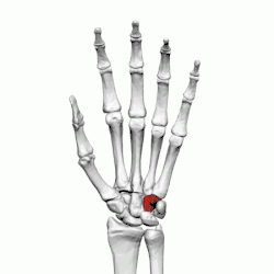 - Fața inferioară (distală) este articulară și are 2 fațete articulare care se articulează cu oasele metacarpiene IV și V.