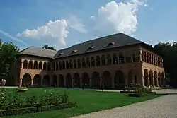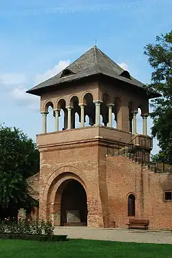 Cuhnia (bucătăria) brâncovenească se află în curtea palatului, având patru turnuri de aerisire. Turnul porții străjuiește intrarea în curte. În el se poate urca pe o scară exterioară. Atât turnul porții, cât și cuhnia au fost restaurate de Martha Bibescu între 1922 și 1930.
