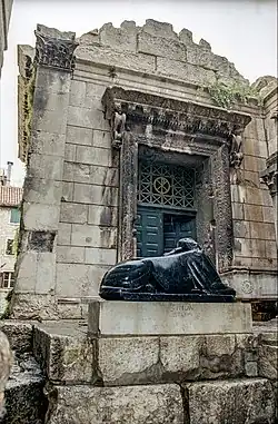 Spațiul interior al temenosului, din jurul Mausoleului, ar fi putut fi pavat sau amenajat ca grădină. Intrarea în Mausoleul propriu-zis, pe muchia de vest, este semnalat printr-o șambrană continuată, bogat decorată cu o viță de vie înconjurată de capete de animale. Două console susțin un coronament în friză. Aproape întreaga verandă inițială a intrării a dispărut, în urma construcției clopotniței între secolele al XIII-lea și al XVII-lea: nu s-au mai păstrat în fundațiile ei decât urme ale celor opt coloane ale verandei, care trebuia să se asemene unei versiuni mai mici a verandei Vestibulului. Două statui ale sfinxului erau plasate de o parte și de alta a scării verandei, și nu este exclus ca și altele să fi înconjurat Mausoleul. Prezența acestor statui egiptene cu puternică conotație funerară, simbolizând străjerii mormântului, este un element care întărește identificarea octogonului cu mausoleul lui Dioclețian. Unul dintre sfincși este din bazalt negru și măsoară 2,46 m lungime și 0,65 m lățime, cu o înălțime de 1 m. Cele două membre anterioare par omenești mai degrabă decât de animal și el ținea un vas pentru ofrande. Pe plinta statuii este o friză gravată cu războinici cu și fără barbă, ținând scuturi pe care sunt înscrise nume de orașe din Palestina: ar putea fi vorba de o inscripție datând din timpul domniei lui Ramses al II-lea (1279-1213 î.e.n.) adăugată pe o statuie datând din timpul faraonului Tutmes al III-lea (1504-1450 î.e.n.). Un al doilea sfinx, inițial plasat în fața primului, este sculptat în granit de Assuan: este mai mic, având o lungime de 1,51 m, o lățime de 0,45 m și o înălțime de 1,44 m — neavând cap, care este spart și desprins. El poartă o inscripție care îl datează în timpul domniei lui Amenhotep al III-lea (1386-1349 î.e.n.).[21] Capul spart al unui alt sfinx, de această dată din granit roz, a fost în schimb descoperit într-o casă: el putea aparține unei alte statui plasată în preajma mausoleului. În fine, un alt cap de sfinx descoperit în 1908 la Salona ar putea proveni dintr-o statuie plasată la început la Split.[22]