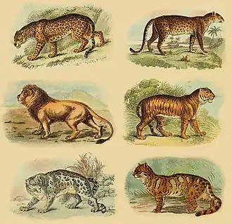 | Subfamilia Pantherinae (de la stânga): jaguar, leopard, leu, tigru, leopardul zăpezilor și leopard de copac | |