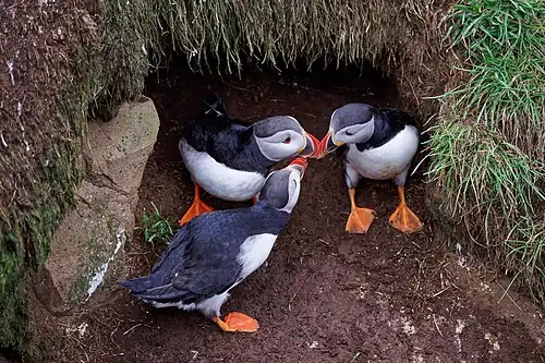 . - ↑ Creelman, E.; Storey, A. E. (). „Sex differences in reproductive behavior of Atlantic Puffins”. The Condor. 93 (2): 390–398. doi:10.2307/1368955. JSTOR 1368955.