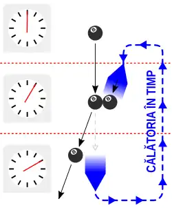 - În mecanica cuantică, interpretarea a mai multor lumi sugerează că fiecare eveniment cuantic ce pare aleatoriu cu o probabilitate diferită de zero de fapt se întâmplă în toate modurile posibile în „lumi” diferite, astfel încât istoria se ramifică constant în alternative diferite. Fizicianul David Deutsch a argumentat că, dacă ar fi posibilă călătoria în trecut, ar trebui să rezulte în aflarea călătorului într-o ramură a istoriei diferită de cea de la care a plecat.[3]