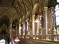 Când intră în Parlament, vizitatorii pot merge până la marile scări ornamentale, pot vedea frescele de pe tavan și bustul arhitectului Imre Steindl, aflat într-o nișă din perete. Alte statui sunt cele ale lui Árpád, Ștefan și Iancu de Hunedoara.