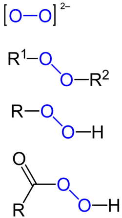 Structura chimică a unor tipuri de peroxizi: ion peroxid, peroxid organic, hidroperoxid organic, peracid. Grupa peroxid este colorată în albastru. R, R1 și R2 resturi hidrocarbonate.