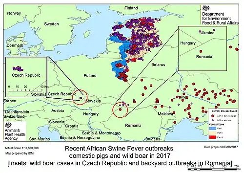 - ↑ Government of the United Kingdom. Department for Environment, Food and Rural Affairs, Animal and Plant Health Agency, Advice Services - International Disease Monitoring. African Swine fever in Eastern Europe. Updated Outbreak Assessment #11, 3rd August 2017