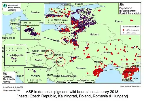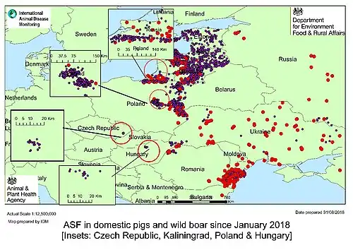 - ↑ Government of the United Kingdom. Department for Environment, Food and Rural Affairs, Animal and Plant Health Agency, Advice Services - International Disease Monitoring. African Swine fever in Eastern Europe. Updated Outbreak Assessment #17, 31 august 2018