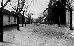 Imagine din Petah Tikva după 1921 Primăria veche (fosta casă a funcționarilor baronului Edmond de Rothschild), strada Montefiori, monumentul victimelor pogromului arab din 1921, stâlp electric și un chioșc