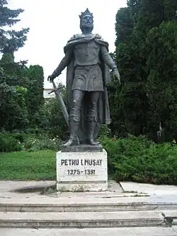 Statuia lui Petru al II-lea, amplasată în Piața 22 Decembrie din Suceava. Inscripția monumentului specifică Petru I Mușat, cum a fost cunoscut de istoriografie până nu demult.