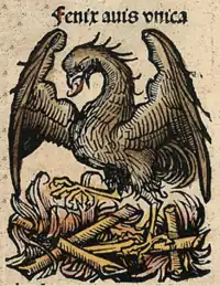 Pasărea Phoenix înfăţişată în Cronica de la Nürenberg sau Schedelsche Weltchronik.