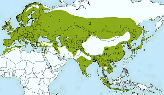 | Arealul speciei, cu cele 4 grupuri de subspecii major, bokharensis, cinereus și minor. | |