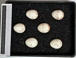 Depune o pontă pe an, în sudul arealului în ani favorabili uneori două. Prima pontă este depusă de femelă din aprilie (mai rar din martie) până în mai. Ponta este formată din 5-11 ouă (de obicei 5-8 ouă), cea mai mică pontă este depusă în nordul arealului. Ouăle sunt fusiforme, netede, slab lucitoare, albe cu pete și puncte roșii purpurii sau maro-roșcate, abundente spre capătul rotund al oului, ele au o dimensiunea medie de 16×13 mm. Femela clocește singură aproximativ 13-18 zile. Masculul aduce hrana la cuib femelei până ce aceasta termină clocitul.[2][5][8][9][10][19]