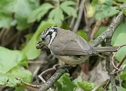 Femela este foarte asemănătoare cu masculul (sexele nu se pot diferenția după penaj pe teren), dar are un moț mai scurt, dungile negre de pe laturile capului sunt mai înguste, marginile penelor de pe creștet și moț sunt mai brun-gălbuii (mai puțin albe), pe flancuri mai mult brun-gălbuii.[9][10][16]