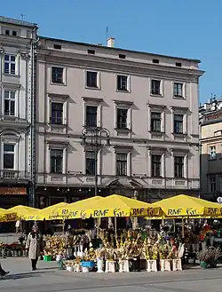 Piața principală este înconjurată de clădiri din cărămida veche (Kamienica) și palate, aproape toate dintre ele vechi de mai multe secole. Cele mai multe clădiri au dobândit un aspect neoclasic de-a lungul timpului, dar structurile de bază sunt mai în vârstă și acest lucru poate fi văzut la cadrul ușilor lor, detalii arhitecturale și interioare. [3] Pivnițe medievale mari ale clădirilor sunt folosite ca pub-uri, restaurante și cabarete. Multe restaurante și cafenele sunt în piață. Una dintre cele mai renumite, Pod Palma (Sub Palmier), la Palatul Krzysztofory a fost deschis în 1876 de către Antoni Hawełka, un furnizor al curții imperiale de la Viena. Acesta este locul Muzeului de Istorie din Cracovia. [5] Printre multe locuri turistice este și Centrul Internațional de Cultură. Probabil cel mai faimos dintre cele mai vechi este restaurantul Wierzynek, a amintit de marea sărbătoare de 1364 care, conform legendei, a durat douăzeci și una zile și a ajutat monarhii din Europa să ajungă la un consens.