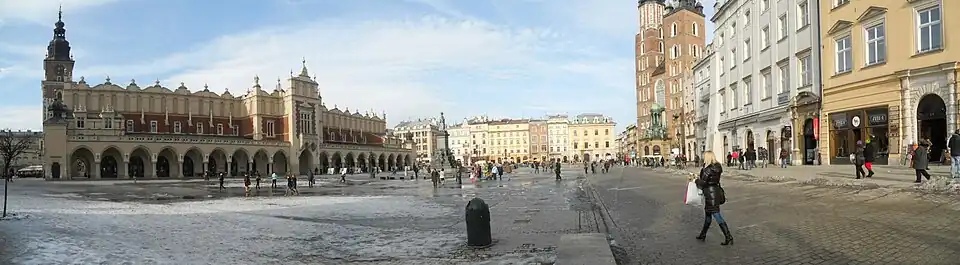 Rynek Glowny este o piață spațioasă înconjurată de case istorice (kamienice), palate și biserici in stil gotic. Centrul pieței este dominat de Sukiennice (sau Hala Postăvarilor), reconstruită în 1555 în stil renascentist, având o mansardă frumoasă decorată cu măști sculptate.