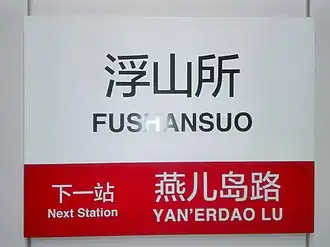 ![]() Semn dintr-o stație de metrou din Qingdao. Denumirea stației curente și cea a stației următoare sunt redate atât în chineză, cât și în pinyin. | |||||||||||||||||||||||||||||||||||||||