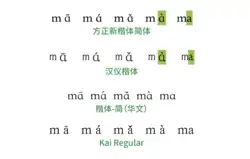 | „Al cincilea” | Neutru | Niciunul; poate fi marcat cu un interpunct înaintea silabei (·◌) | 0, 5 sau niciunul | ma, ·ma | ma0, ma5, ma | [ma] | [ma⁰] | [ma꜋], [ma꜊], [ma꜉], [ma꜌][g] |