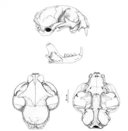 Craniul îi este arcuit pe plan lateral, cu arcade zigomatice largi. Pavilioanele urechilor sunt triunghiulare, iar canalul auditiv este foarte larg, oferindu-i pisicii un auz îmbunătățit. Bula auditivă(en)[traduceți] și pasajele de la urechile externe către timpane sunt puternic lărgite comparativ cu cum este la alte pisici sălbatice de dimensiune mică; părțile interioare ale urechilor sunt protejate de obiecte străine de fire de păr albe și lungi, situate aproape unul de altul.[25] Are o forță a mușcăturii(en)[traduceți] la vârful caninului de 155,4 newtoni și un coeficient al forței mușcăturii(en)[traduceți] la vârful caninului de 136,7.[30]