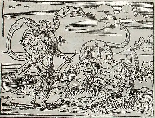 Apollo omorând șarpele Python. Gravură din 1581 de Virgil Solis pentru Metamorfozele lui Ovidiu, Cartea I