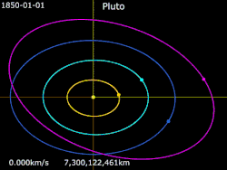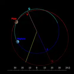 Perioada orbitală a lui Pluto este de aproximativ 248 de ani. Caracteristicile sale orbitale sunt substanțial diferite de cele ale planetelor care urmează orbite aproape circulare în jurul Soarelui, aproape de un plan de referință plat numit ecliptică. În schimb, orbita lui Pluto este moderat înclinată față de ecliptică (peste 17°) și moderat excentrică (eliptică). Această excentricitate înseamnă că o mică regiune a orbitei lui Pluto se află mai aproape de Soare decât cea a lui Neptun. Baricentrul Pluto-Charon a ajuns la periheliu la 5 septembrie 1989 [2][f] și a fost ultima dată mai aproape de Soare decât Neptun între 7 februarie 1979 și 11 februarie 1999.[34]