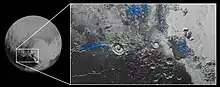 Emisfera nordică a lui Pluto în culori reale, fotografie realizată de New Horizons în 2015.[a] | |