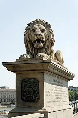 Placa de pe partea dinspre Pesta a fluviului conține o inscripție tradusă astfel în limba română: „Pentru a rememora singurele două poduri rămase dintre cele proiectate de William Tierney Clarke: Podul cu Lanțuri Széchenyi peste Dunăre de la Budapesta și Podul suspendat peste Tamisa de la Marlow, Anglia.”