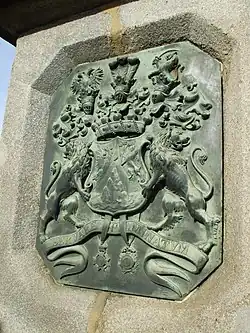 Stema familiei Sina, placată sub unul din leii care străjuiesc podul