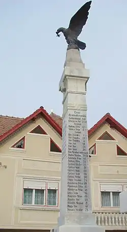 - Monumentul Eroilor Români din Primul Război Mondial. Obeliscul se află amplasat în fața Școlii Generale. Acesta a fost dezvelit în anul 1923, pentru cinstirea eroilor români căzuți în Primul Război Mondial. Monumentul are o înălțime de 5 m și este realizat din beton, marmură și bronz, fiind împrejmuit cu un zid din beton. Pe fațada Monumentului se află un înscris comemorativ: „Nu plângeți eroii/ ci slăviți-i“. Pe spatele obeliscului sunt înscrise numele a 26 eroi, iar pe fiecare dintre cele două laterale sunt înscrise numele a câte 28 eroi, care au luptat pentru dezrobirea neamului.