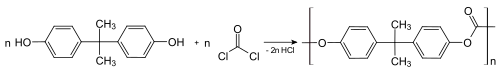 - Na2(OC6H4)2CMe2 + COCl2 → 1/n [OC(OC6H4)2CMe2]n + 2 NaCl