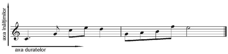 - pe abscisă (axa orizontală) se notează duratele sunetelor (inclusiv ritmul)