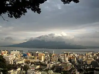 Municipiul Kagoshima pen fundalul muntelui Sakurajima