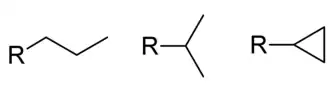 De la stânga la dreapta: cele două forme izomere ale propilului (n-propil, izopropil), și o grupă ciclopropil
