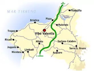 - Autostrada A3 pentru 41 km (de la Nord la Sud: ieșirile din Pizzo, Sant'Onofrio-Vibo Valentia Nord, Serre-Vibo Valentia Sud, Mileto)