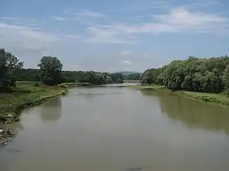 ![]() Râul Suceava văzut de pe Podul rutier din Ițcani - în amonte | |