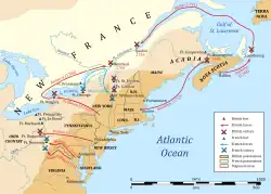 În 1755, șase guvernatori coloniali s-au întâlnit cu generalul Edward Braddock(d), comandantul Armatei Britanice recent sosit, și au pus la cale un atac pe patru căi împotriva francezilor. Niciuna din căi nu a avut succes, și efortul principal(d) al lui Braddock s-a soldat cu un dezastru; el a pierdut bătălia de pe Monongahela(d) din , și a murit după câteva zile. Operațiunile britanice au eșuat în zonele de frontieră ale Provinciei Pennsylvania(d) și ale Provinciei New York în anii 1755–1757 din cauza unei combinații între conducerea slabă, disensiunile interne, acțiuni eficiente ale iscoadelor canadiene(d), forțelor regulate franceze, și aliaților războinici băștinași ai acestora. În 1755, britanicii au capturat Fort Beauséjour(d) de pe granița ce despărțea Nova Scotia de Acadia, și curând au ordonat expulzarea acadienilor(d) (1755–1764). Ordinele de deportare au fost date de comandantul suprem William Shirley(d) fără îndrumări în acest sens din Marea Britanie. Au fost expulzați toți acadieni, atât cei capturați cu arme cât și cei care juraseră credință regelui. Și băștinașii au fost izgoniți din acel teritoriu, pentru a face loc coloniștilor din New England.[10]
