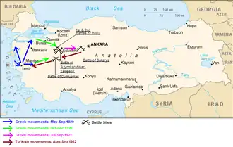 După retragerea turcilor conduși de Ismet Inönü după înfrângerea de la Kutahya-Eskisehir, armata greacă a înaintat până la cursul râului Sakarya/Sangarios, la mai puțin de 100 km de Ankara. Regele Constantin era așa de încrezător în victorie, încât a invitat o serie de înalți ofițeri britanici la un dineu care să celebreze victoria împotriva lui Kemal în orașul Ankara[33]. Grecii au considerat că revoluționarii turci, care evitaseră până atunci să fie încercuiți, aveau să fi atrași într-o bătălie pentru apărarea orașului Ankara și vor fi distruși în cele din urmă.
