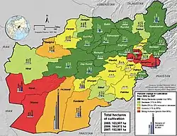La scurt timp după invazia condusă de SUA producția de opiu a crescut semnificativ.[50] Până în 2005, Afganistanul a recâștigat poziția de producătorul numărul 1 de opiu din lume și producea 90% din opiul din lume, cea mai mare parte este transformat în heroină și vândut în Europa și Rusia.[51] În 2009, BBC a raportat că „descoperirile ONU spun că există o piață de opiu în valoare de 65 miliarde de dolari, care finanțează terorismul la nivel mondial, formată din 15 milioane de dependenți, și ucide 100.000 de oameni în fiecare an.”[52]