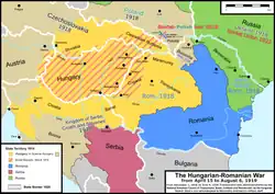 ![]() Trupele române ocupând Budapesta, în luna august 1919 | |||||||