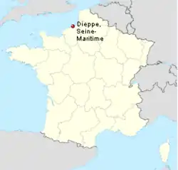 Dieppe, un oraș de coastă din departamentul francez Seine-Maritime, se întinde pe o faleză de-a lungul Canalului Mânecii. Râul Scie curge în vestul orașului și Râul Arques traversează Dieppe, după care se varsă într-un liman de dimensiuni medii. Germanii demolaseră până în 1942 mai multe clădiri din apropierea mării pentru a facilita apărarea după amplasarea a două baterii de artilerie la Berneval-le-Grand și Varengeville. Unul dintre motivele importante pentru alegerea orașului Dieppe era acela că se afla în raza de acțiune a avioanelor de vânătoare RAF.[8]