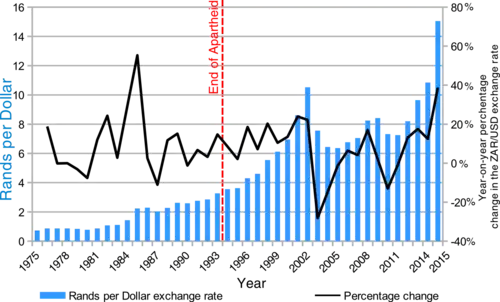 - ↑ en „U.S. Dollar to South African Rand Spot Exchange Rates for 1975 to 2020 from the Bank of England”. www.poundsterlinglive.com (în engleză). Accesat în .