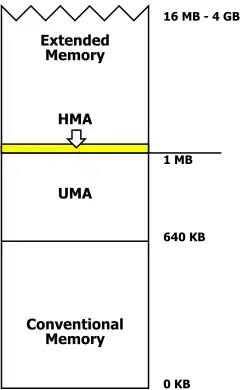 - Memoria superioară - este formată din următorii 384 Kb, rămași disponibili până la 1Mb. Această zonă de memorie este împărțită în felul următor: primii 128 Kb sunt rezervați pentru a fi utilizați de adaptoarele video pentru memorarea informației afișate pe ecran, următorii 128 Kb sunt pentru a fi folosiți de diferite adaptoare ce se pot conecta la sistem cum ar fi placa video, placa de rețea, etc, și ultimii 128 Kb sunt rezervați pentru a fi utilizați de componenta BIOS a sistemului.