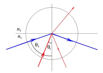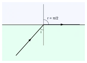 în care este indicele de refracție al mediului din care pornește raza, este indicele mediului opus, i este unghiul de incidență, iar r unghiul de refracție. Lui r i se dă valoarea π/2, sinusul corespunzător devine 1, iar unghiul critic este egal cu unghiul de incidență în aceste condiții: