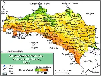 În timpul Primului Război Mondial, Galiția a fost unul dintre cele mai sângeroase teatre de luptă a Puterilor Centrale și Imperiului Rus. Forțele ruse au reușit să ocupe cea mai mare parte a teritoriului Galiției în 1914. Rușii au fost respinși în primăvara și vara anului 1915, în urma unei acțiuni cobinate germano-austro-ungare.