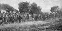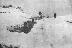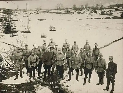 ![]() Subunitate a regimentului în fața unui adăpost, în 1917 la Oituz | |