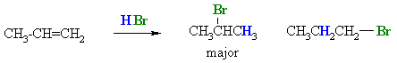 Același mecanism de reacție are loc și la adiția apei la o alchenă, reacție prin care se formează un alcool. Gruparea hidroxil (-OH) se leagă de carbonul mai sărac în hidrogen (care participă la mai multe legături), iar H se leagă de carbonul 2 al legăturii duble (mai bogat în hidrogen). Explicația constă în formarea unui carbocation în timpul procesului de adiție. Carbocationul se formează prin legarea atomului de hidrogen la un atom de carbon al duble legături, ceea ce induce formarea la al 2-lea atom de carbon a unei sarcini pozitive, sarcină pozitivă ce va determina stabilitatea carbocationului. Cu cât carbonul la care se formează sarcina este mai substituit (participă la mai multe legături) cu atât el va fi mai stabil. Concluzia care se trage este: cu cât produsul intermediar va fi mai stabil cu atât produsul final va fi în proporție mai mare. Generalizând, adiția unui compus de tip HX (unde X este un atom cu o electronegativitate mai mare față de H), la molecula unei alchene se va face astfel: X se va lega de carbonul mai substituit iar H se va lega de carbonul mai puțin substituit.